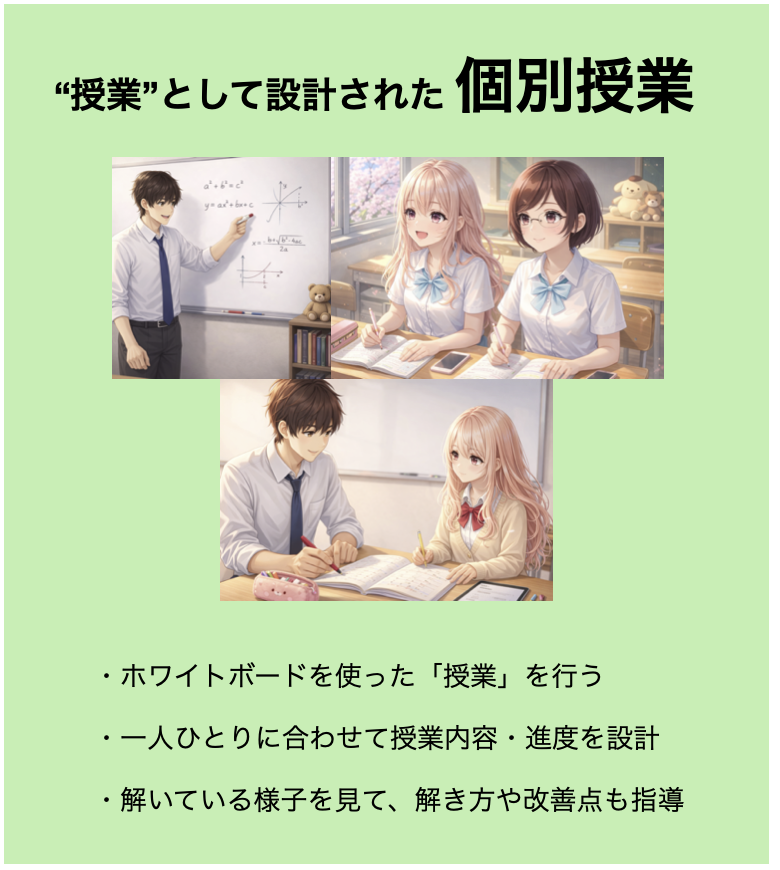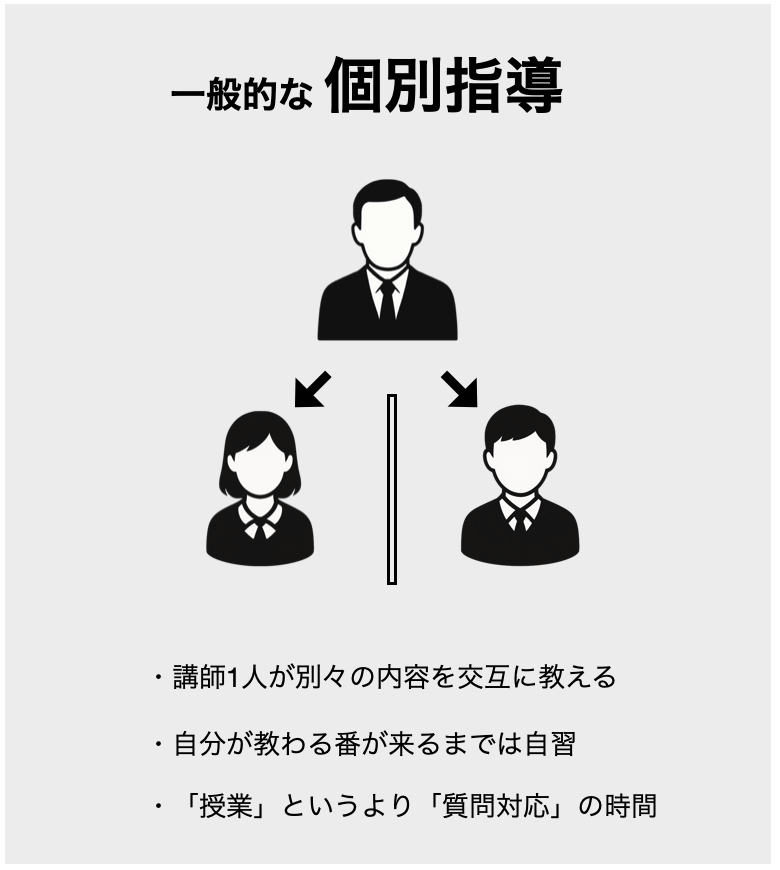 当塾の授業は、いわゆる“個別指導”とは違います。
