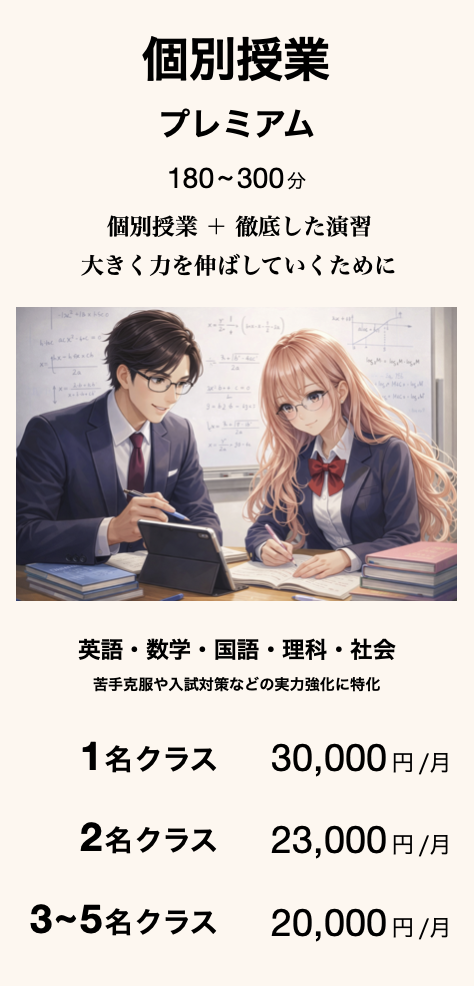 私立入試対策プレミアムコースは、通常のスタンダードコースの内容に加え、演習時間をしっかり確保することで徹底的に問題演習を繰り返し、より確実な実力養成を目的としたコースです。